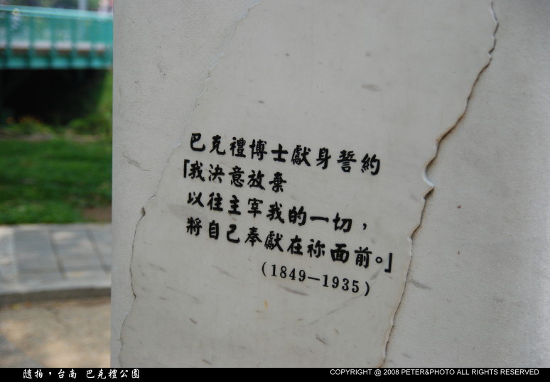 巴克禮紀念公園位於台南市東區南隅,原名十八號公園,台南市為緬懷巴克禮博士對台灣的大愛奉獻精神,於92年6月5日改名為巴克禮紀念公園。 至於巴克禮博士的事蹟網路上有相當詳細的記載,因此就不在這多加描述。此公園在文化中心的對面,雖然整個公園的範圍並不是挺大的,但整體的規劃卻讓我感到相當的輕鬆、自在。