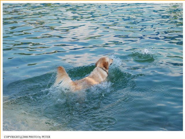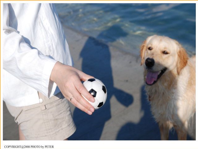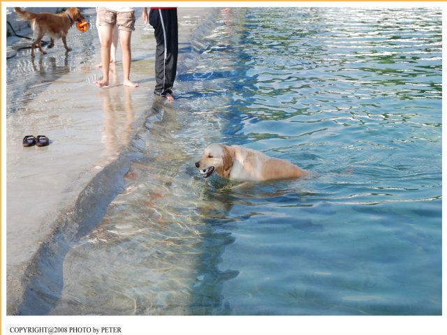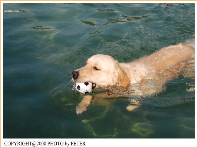 看看我們家的黃金妹妹,緊盯游泳必備的球(趕快丟、我要下水了啦)。
